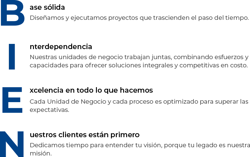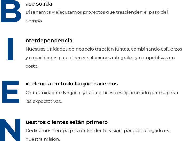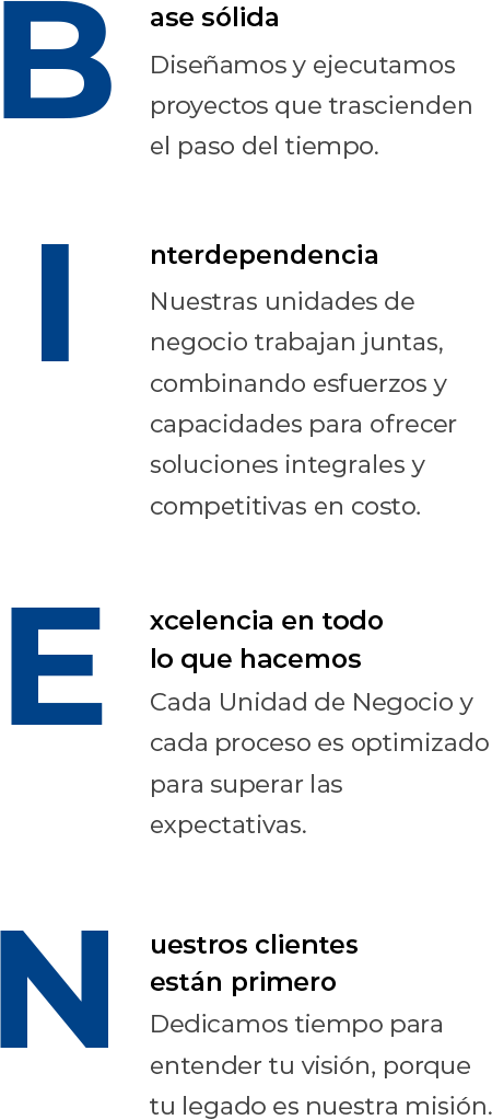 Sabemos que un legado no es fruto del azar, sino el resultado de hacer las cosas bien, hoy y siempre . Nuestro principio “Construimos BIEN” guía cada decisión, cada proyecto y cada relación.